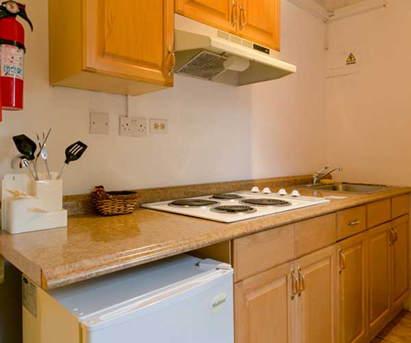 A choice of twin beds or romantic king size four- poster beds are available. Fully equipped kitchenettes, fan, a/c, phone, wireless internet & cable TV.